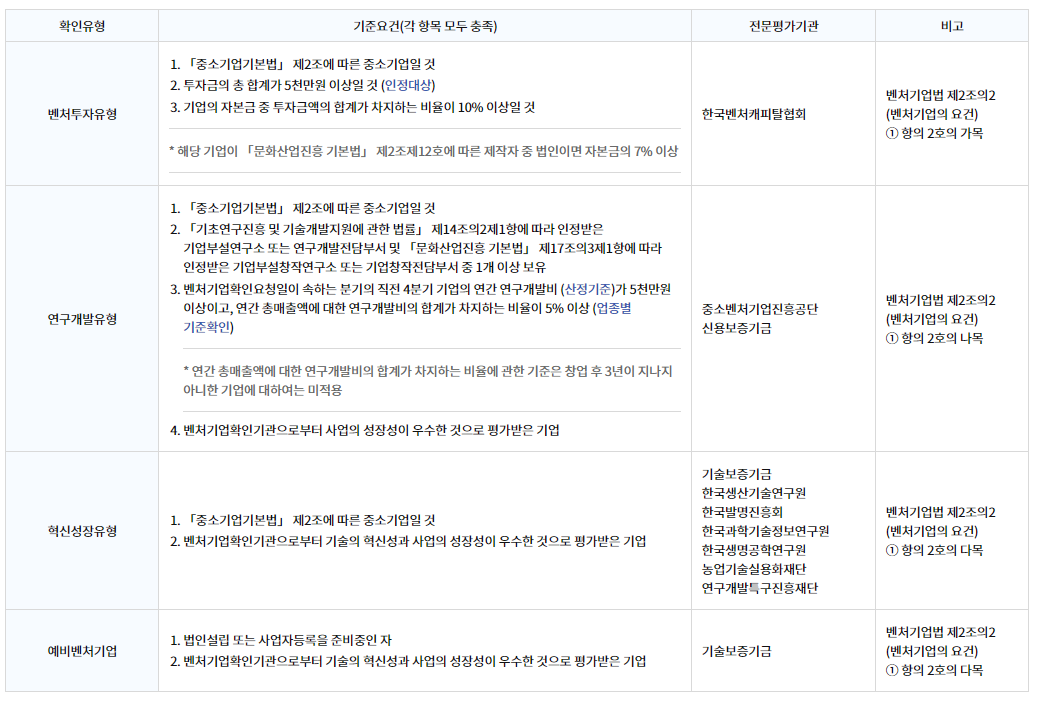 다음의 벤처기업 유형별 확인 요건을 충족하는 중소기업